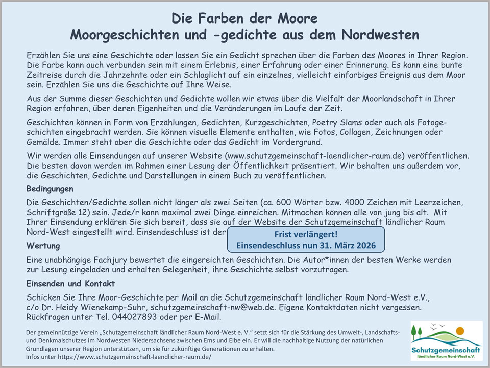 Die Moorgeschichten und -gedichte sollen bitte per E-Mail an die Schutzgemeinschaft ländlicher Raum Nord-West e.V. geschickt werden, c/o Dr. Heidy Wienekamp-Suhr